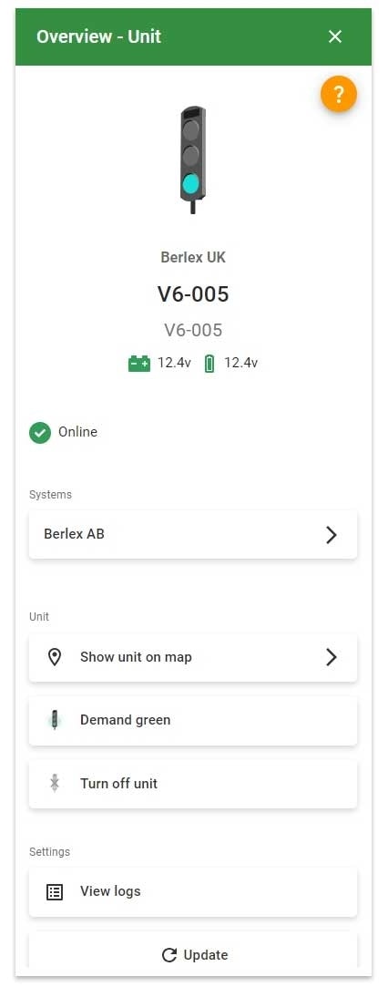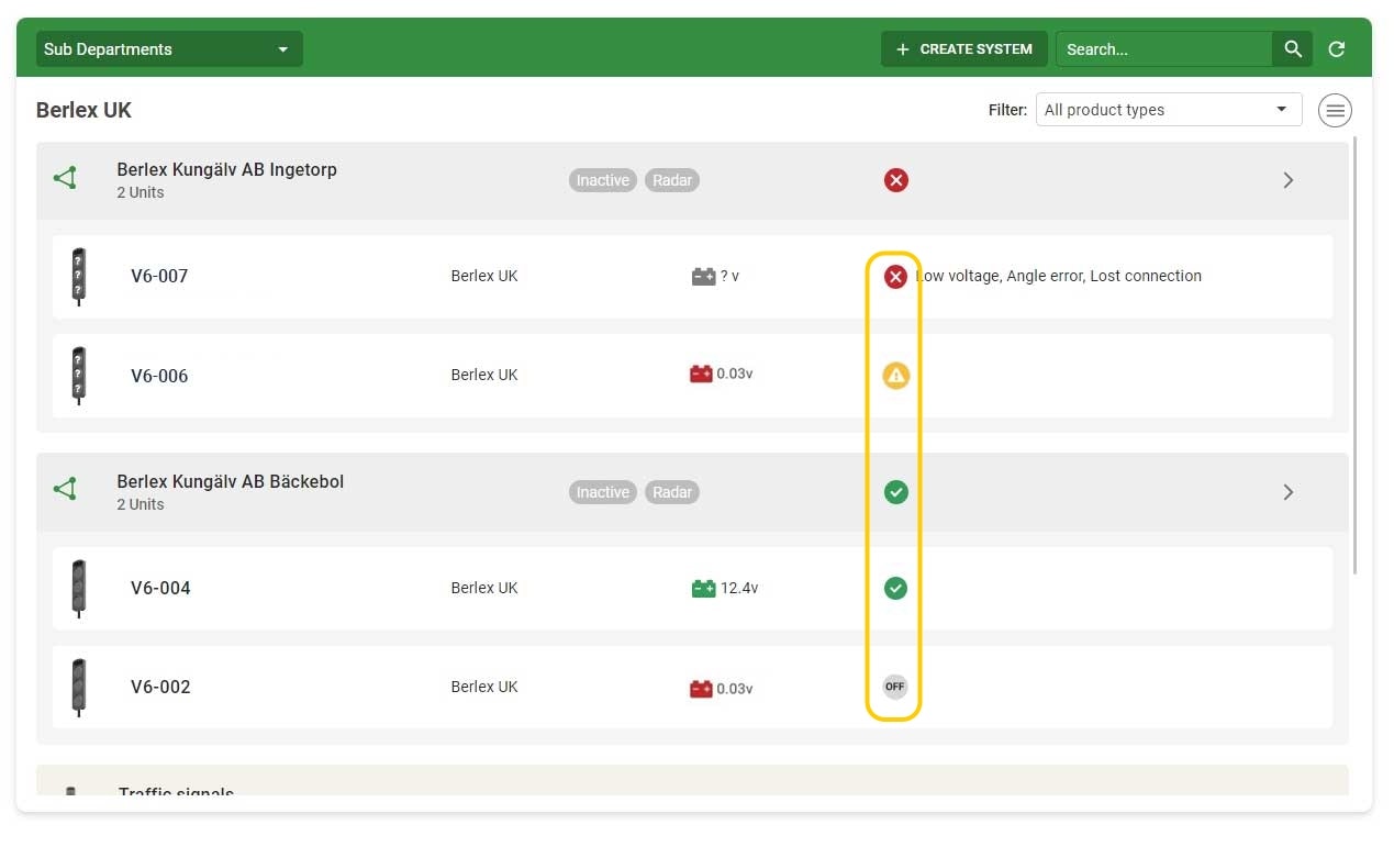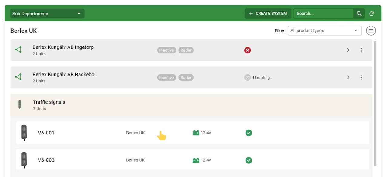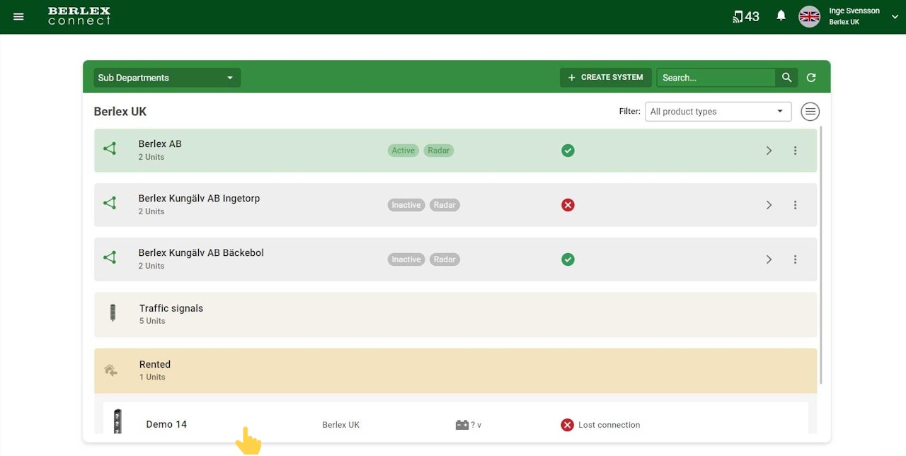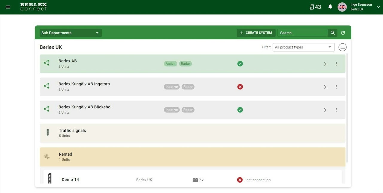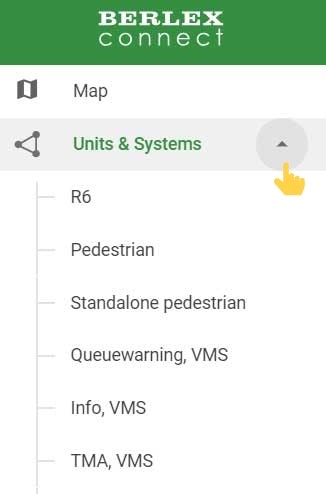 This page shows a list of all the organisation's units and systems that are connected to BerlexConnect. Initially, all the different types of systems and units present in the organisation are displayed, grouped in the order: