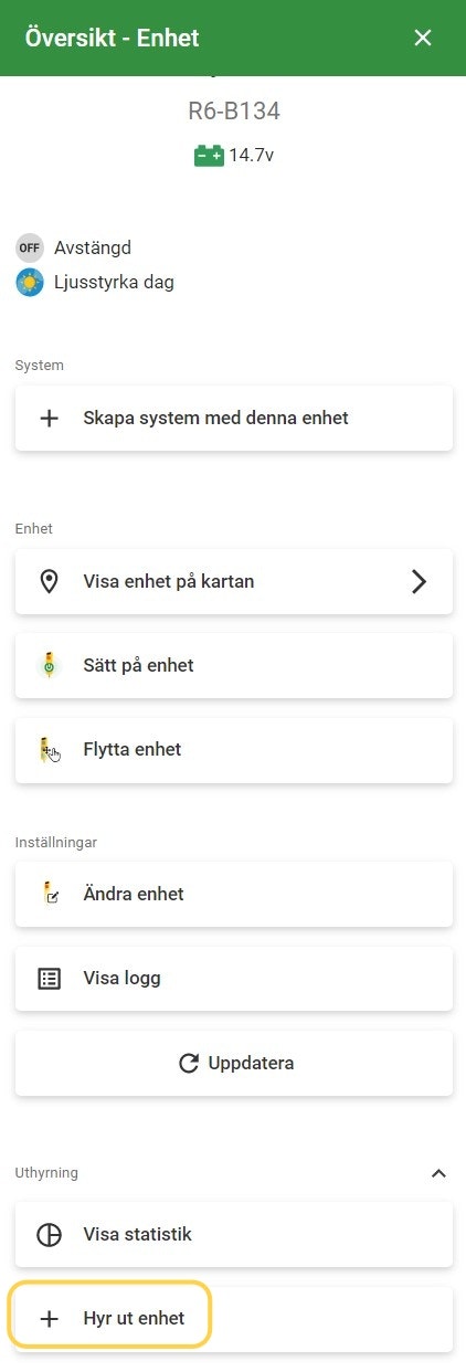 Shortcut from the device overview to manage device rental internally or externally to someone else's organization.