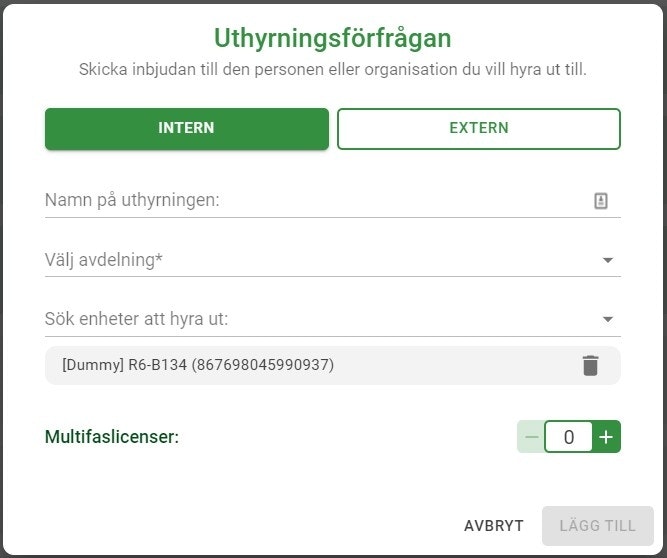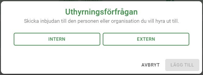 The difference between internal and external is that in the case of internal, a dropdown list appears with the own organization's subdivisions. For external rental, an email address must be entered. See more under the Organization menu; Rental.