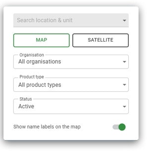 In the search function under the Map menu, you can easily search for units and systems based on location or the name of the unit. This narrows the map to the selected location or unit. You can also select a unit directly via the drop-down menu. The map can be displayed in two ways, map or satellite. There is also the option to filter on your own organisation and sub departments. FIlter on Active, Inactive or All, in the status view.