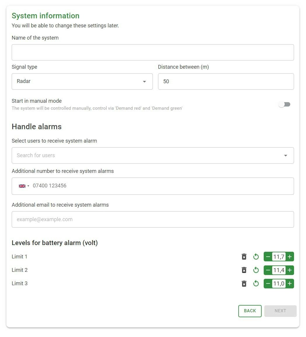 In this dialog you will set up system name, signal type, distance system and battery alarms.